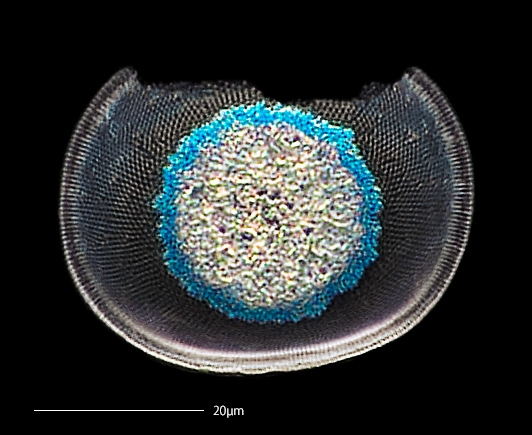 Das Bild ist übrigens auch interessant aufgenommen, die Kieselalge lag in einer Petrischale auf dem Grund in ca. 0.5 cm destilliertem Wasser. Dann mit einem 40x/0.8 "water dipping" Objektiv eingetaucht, und bei einem komfortablen Arbeitsabstand von 3.3mm (bei NA 0.8!) von aussen mit Faserlicht und Tischtennisball beleuchtet.
