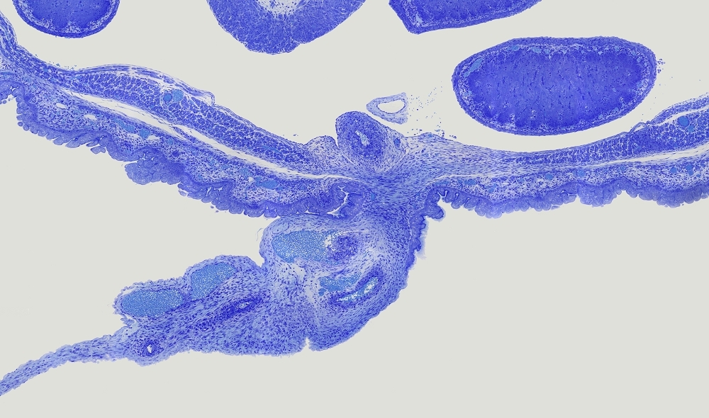 Die Nabelschnur ist jetzt besser zu sehen und man sieht schon die anschnitte von die Vene und Arterien mit viele Blau gefärbte Blutzellen.