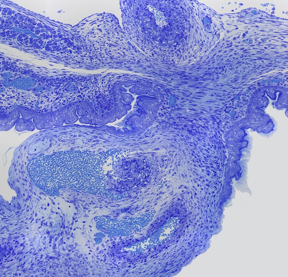 Die Färbung ist eine Toluidin Blau (1%) / Natriumtetraborat (1%) in Aqua Dest. Eingeschlossen wurde in Depex.