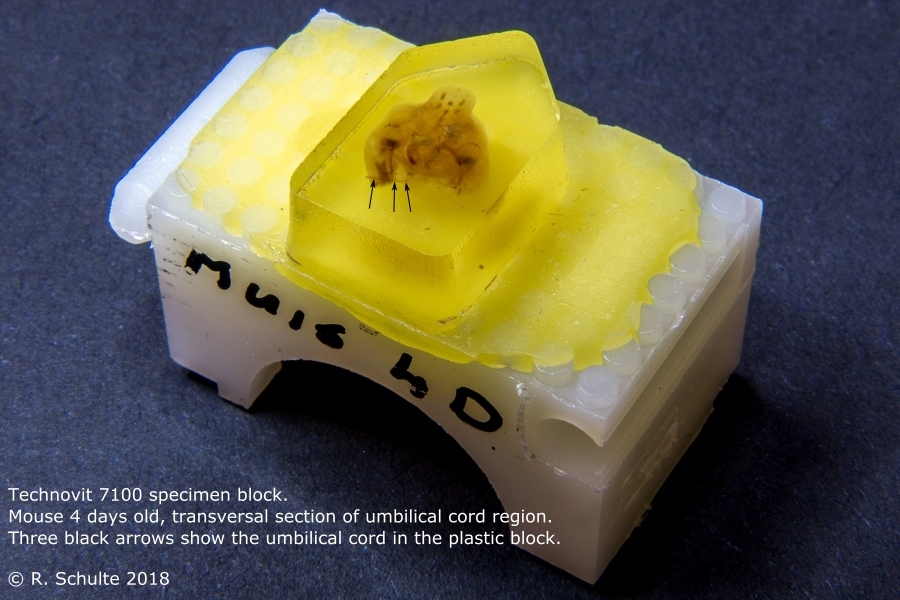 Eingebettet wurde das Teil über eine steigende Ethanolreihe in Technovit 7100. Geschnitten wurde das Block am LKB 2218 Historange Mikrotom mit Kulzer einmalklingeln und den eigentlichen Schnitt wurde geschnitten mit ein Leica Hartmetall D Schliff Messer.
