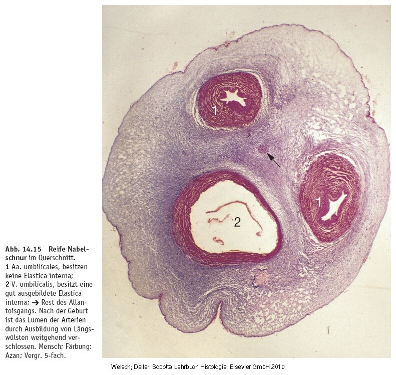 Die 50-60 cm lange Nabelschnur verbindet Plazenta und Leibesfrucht und hat Versorgungs- und Entsorgungsfunktion. Sie besteht aus einem Strang gallertigen Bindegewebes, der vom Amnionepithel bedeckt wird und in dem die zwei Arteria umbilicales und die Vena umbilicalis verlaufen. Die Vena umbilicalis fuhrt O2-reiches Blut, die zwei Umbilikalarterien leiten )2-armes Blut aus dem Embryo bzw. Fetus in die Plazenta. Der in den ersten Schwangerschaftsmonaten noch gut ausgebildete Allantoisgang ist in der reifen Nabelschnur weitgehend zurückgebildet. Die Allantois ist die rudimentäre embryonale Harnblase. Bei Reptilien und Vögeln ist ihre kapillarreiche Wand auch Atemorgan, das der Eischale innen anliegt. Der primäre Kapillarreichtum der Allantois befähigt dieses Organ in besonderem Maße, zu Plazentastrukturen beizutragen. Die Bindegewebsmatrix enthält Bündel feiner Kollagenfibrillen und in reichem Maße Hyaluronsäure und Proteoglykane. Die Fibroblasten sind noch in der reifen Nabelschnur sehr aktive, große Zellen. Blutkapillaren fehlen in der Nabelschnur.