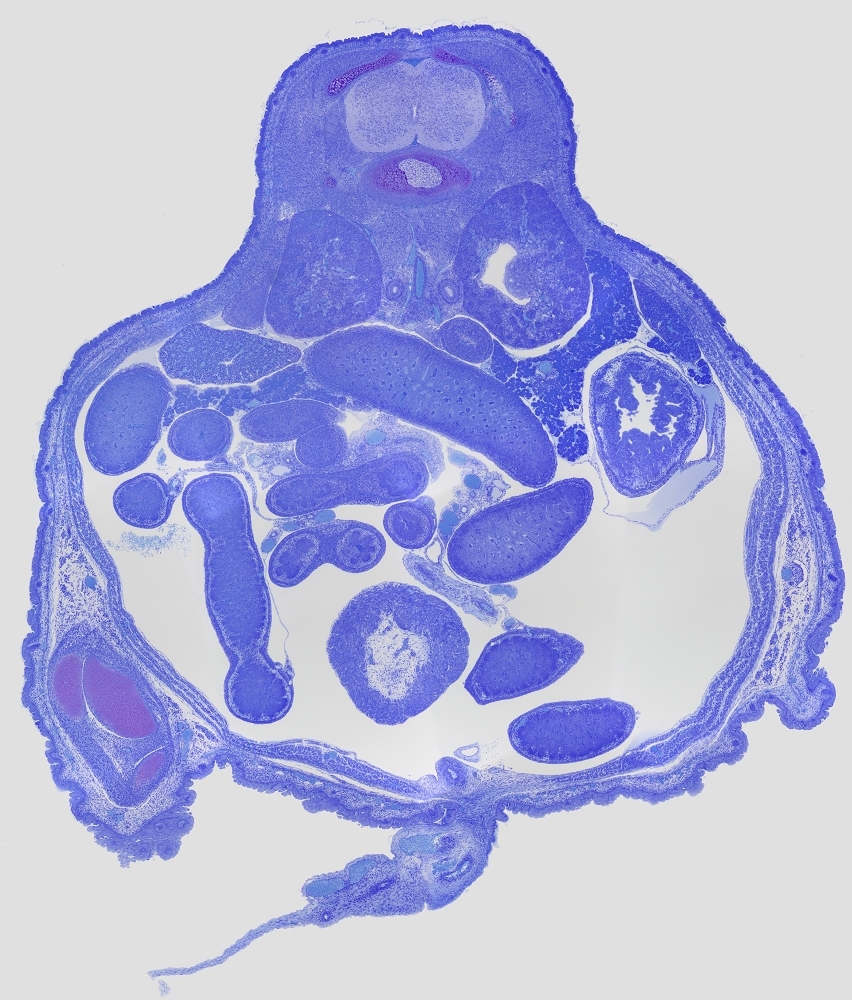 Die Nabelschnur ist unten zu sehen. Oben zeigt sich das Rückenmark. Mitte, Darmen und dazwischen Pancreas. Links, anschnitt von das Linker Hinterbein.