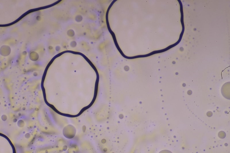 das ist natürlich ein schlagender Beweis, dass Pilz ausgeschlossen werden kann. Ich werde am WE mal am Heitztischmikroskop schauen, was bei welcher Temperatur passiert. Ich tippe nun auf Konservierungsmittel Benzoesäure oder Salizylsäure. Wäre aber dann erstaunlich viel.