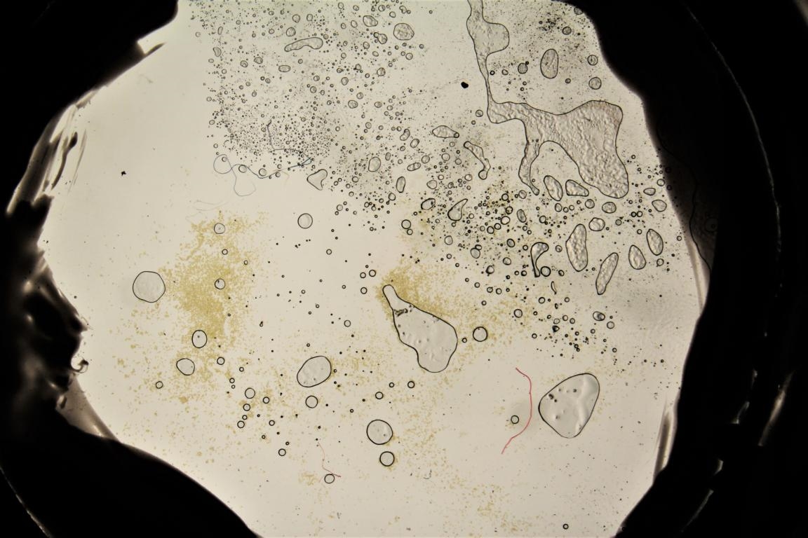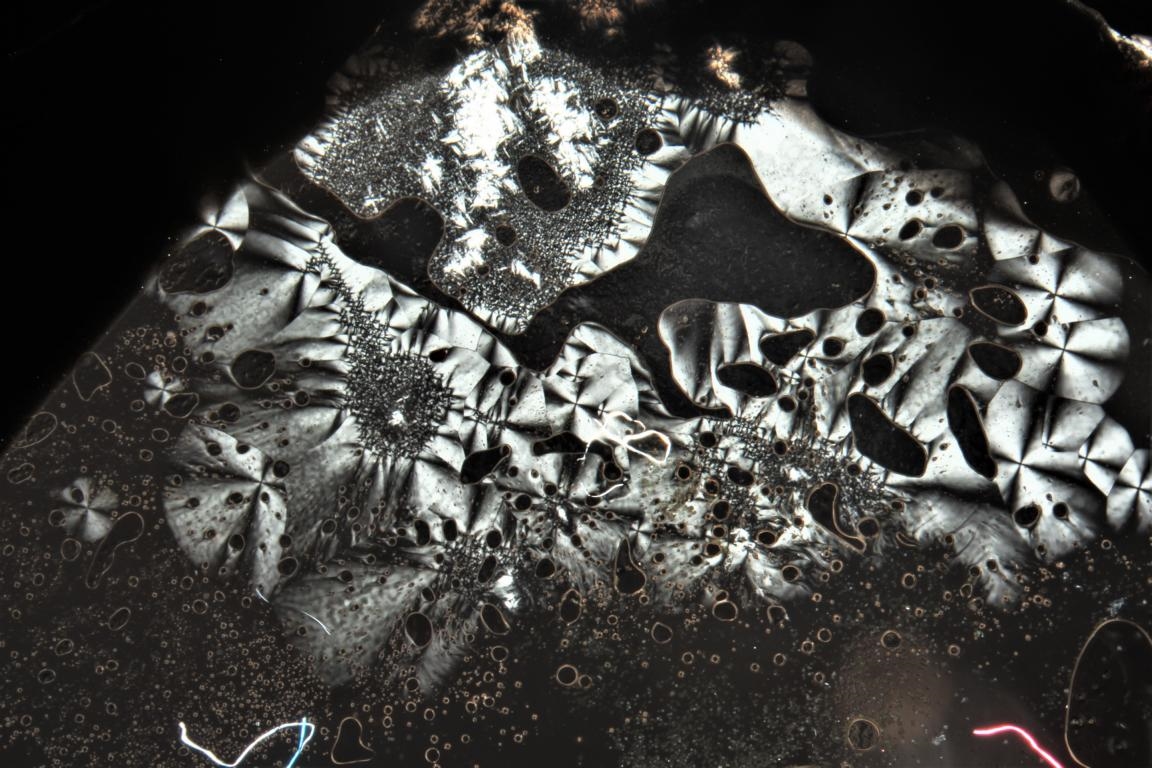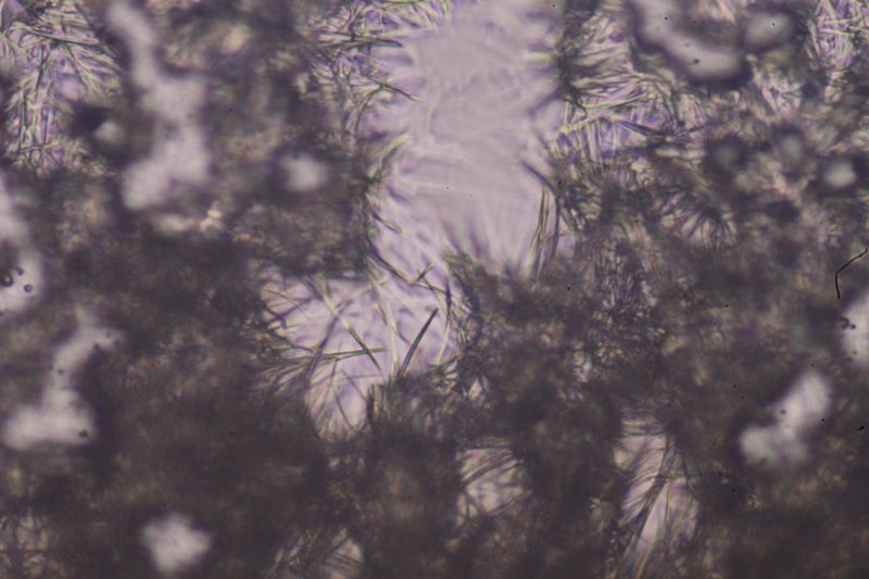 Dann noch Bilder am Durchlichtmikroskop bei höherer Vergrößerung für Details. Man sieht einmal die ungelösten Kristalle und dann zusätzlich flächige Kristallrosetten, die beim Abkühlen gewachsen sind. Na ja, und - schwere Schlamperei! ;D - Fusseln! Das letze Bild zeigt, dass die Pollen sich von der Erwärmung nicht beeindrucken lassen.