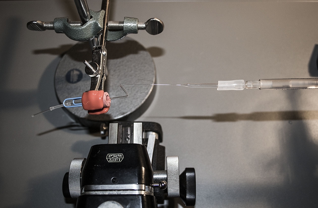 Diese kompliziert geformte und gemessene Kapillare lässt sich in der schrägen Ebene verschieben, sodaß sie mit einer