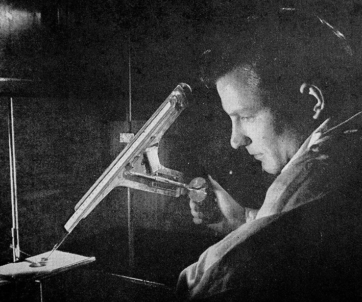 Es zeigt einen Mitarbeiter von G.T.Seaborg bei einer Mikrotitration mit einer "Kirk-Burette".