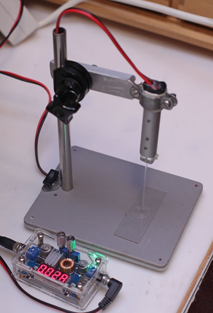 Als Stromversorgung wurde vorläufig eine meiner LED-Versorgungen verwendet, da sich hier Strom und Spannung getrennt regeln lassen und die Werte im Display abgelesen werden können. Ein Schalter befindet sich neben dem Stativsäulchen.