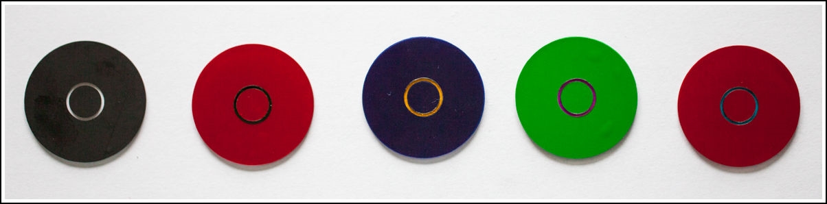 Heute bastelte ich mir verschiedene Ringblenden. Da ich in der Werbetechnik tätig bin habe ich eine Plotter mit Schleppmesser, welcher farbige Selbstklebefolien ausscheiden kann. Als Filtergläser habe ich mir schon früher 32mm-Durchmesser-Uhrgläser gekauft.