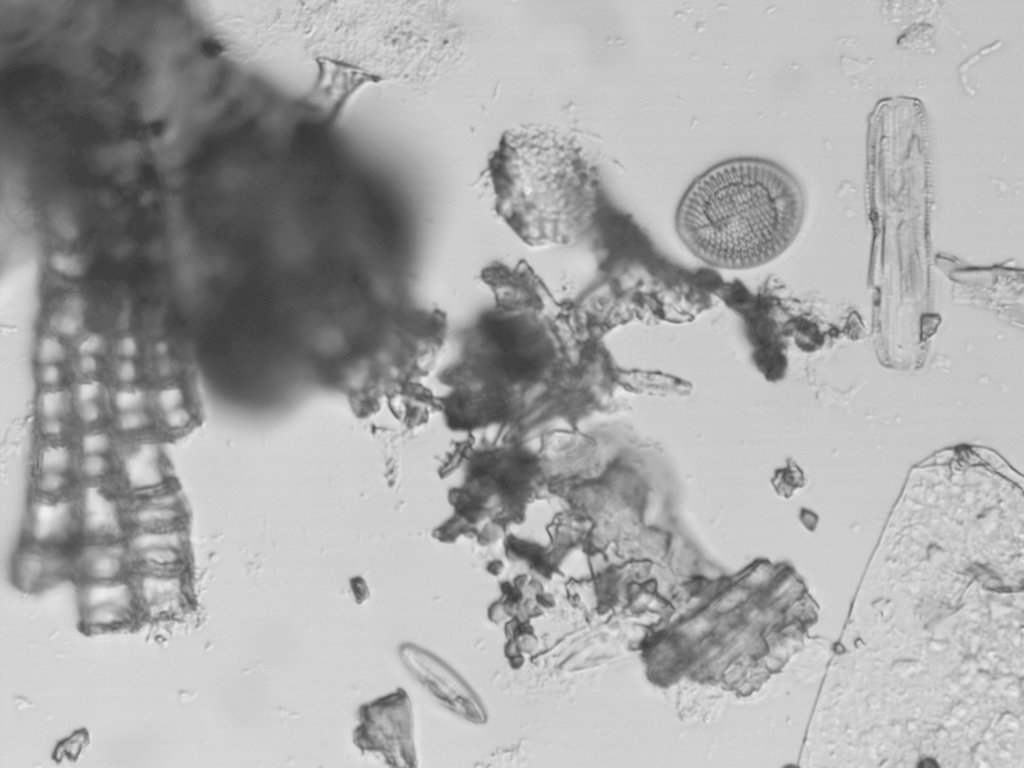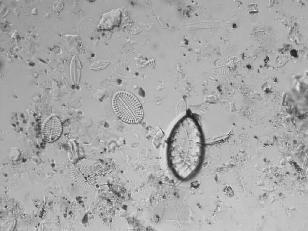 Zur Auflockerung des Beitrags noch ein paar Bilder aus dem gewonnenen, chemisch nicht aufbereitetem Seegras-Diatomeen-Konzentrat (um Einzelobjekte frei stehend zu haben, stark verdünnt, ein Tropfen auf Objektträger getrocknet und nur mit 0,170 mm Deckglas abgedeckt.)