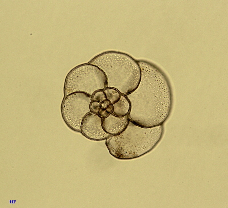 Aber an eine Bestimmung traue ich mich da nicht. Foraminiferen werden üblicherweise mit drei Aufnahmen im Auflicht (oder REM) bestimmt: 'linke' Seite, 'rechte' Seite, Ansicht der Öffnung.