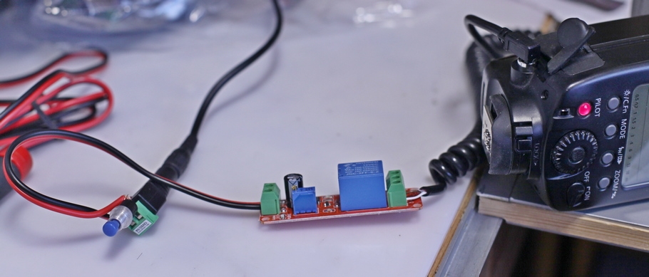 Blitz ist über normales Blitzkabel angeschlossen und das Relais über einen kleinen Drucktaster an 12 V (Steckernetzteil). Die Verzögerung war auf 20 sec voreingestellt und ließ sich mit dem Trimmpoti problemlos auf Sekundenbruchteile herunterregeln.