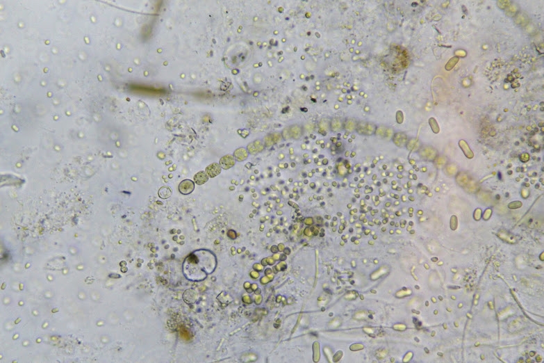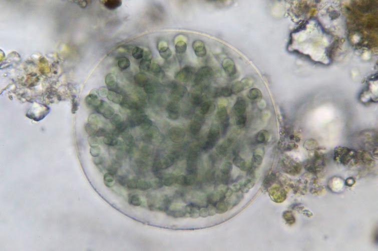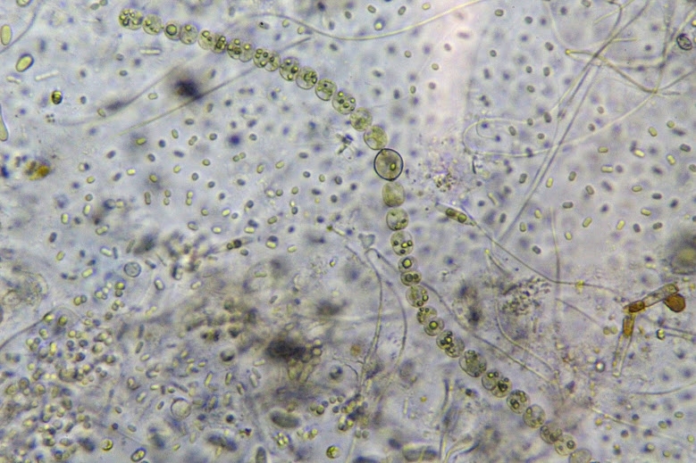 Anabaena in einer Gallertflocke, die wiederum in einer größeren Gallerte lokalisiert ist, die mit einer unabzählbaren Anzahl von grünen Mikroalgen gefüllt ist, die von mir unmöglich zu identifizieren sind - obwohl ich gerne wüßte wie sie heißen.