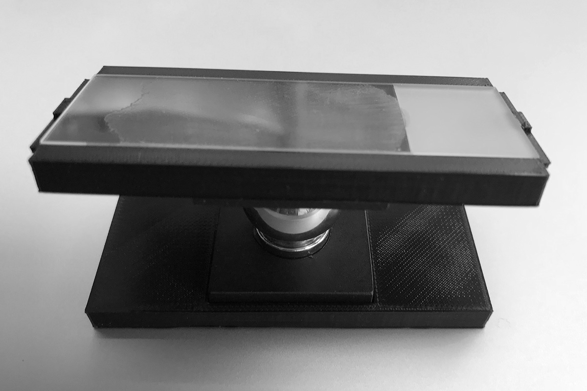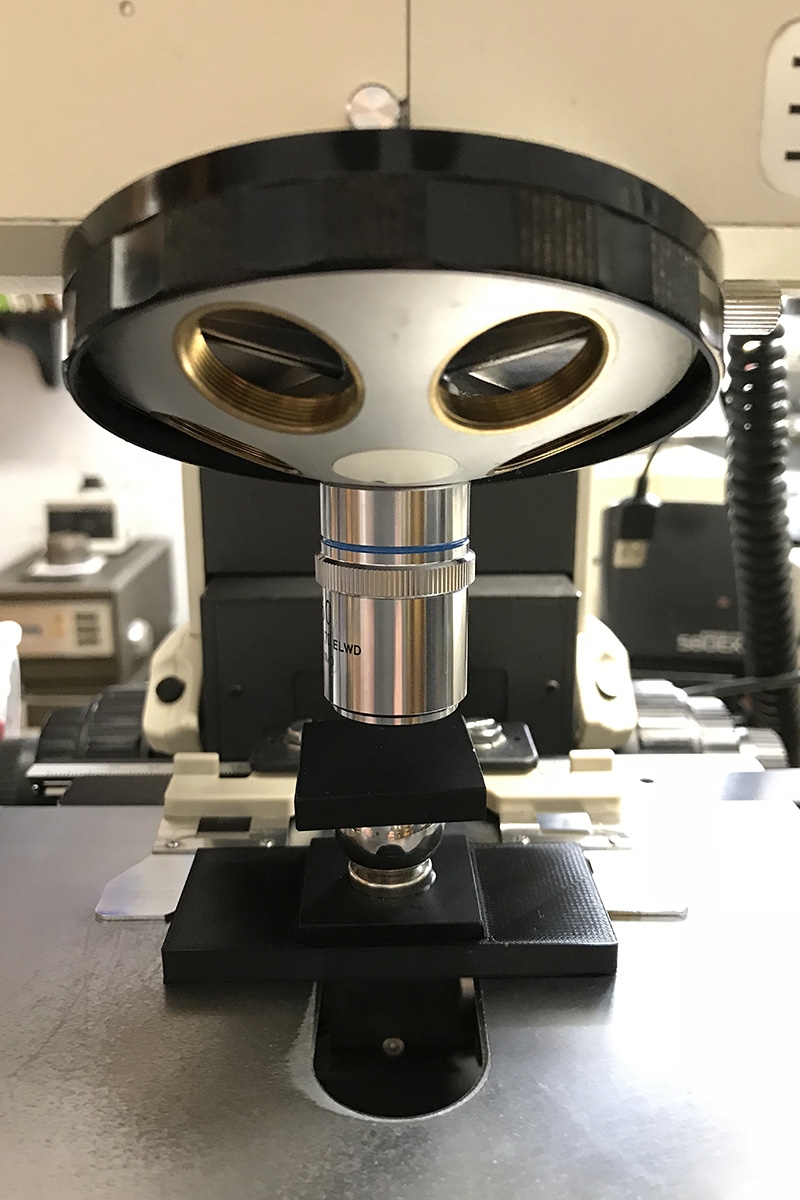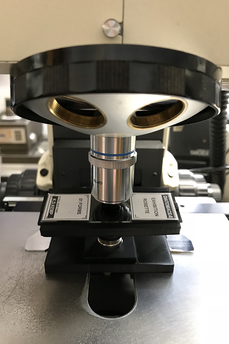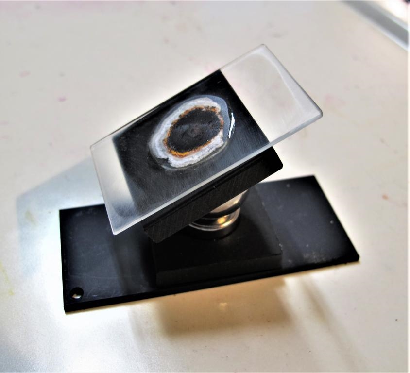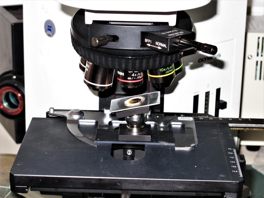 Zu deiner edlen Ergänzung kann ich nur sagen: passt natürlich zum Kugeltisch. Aber für die, die zu Hause keinen 3D-Drucker haben gibt es eine einfache Lösung. Objektträger kann man wie alle anderen Objekte mit dauerplastischem Abdichtkitt aufkitten und den Fuß stellt man auf einen OT hier habe ich einen aus Metall verwendet, aber aus Glas geht natürlich auch. Man sieht er passt problemlos unters BX 50, wenn man den Tisch absenkt.