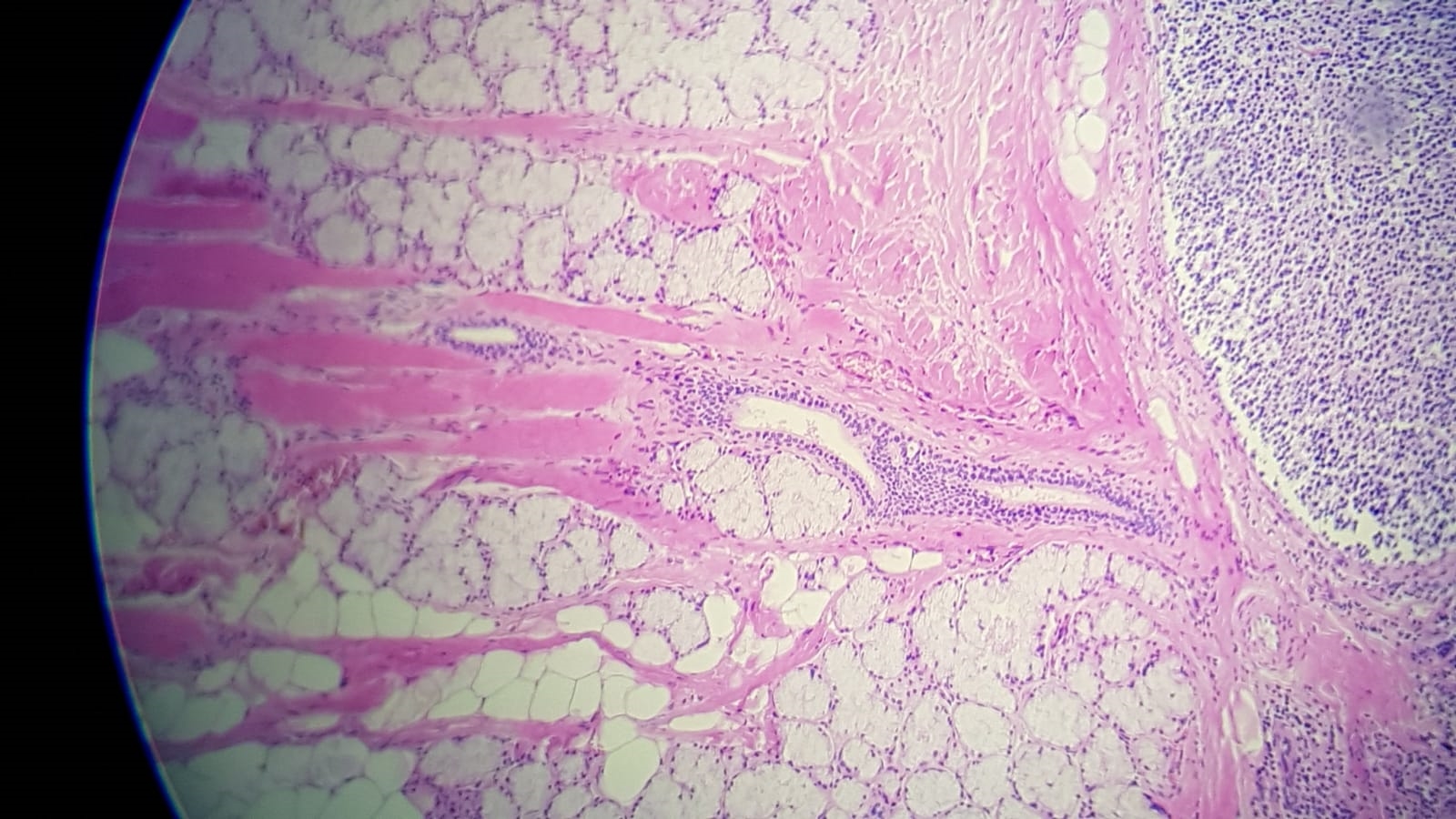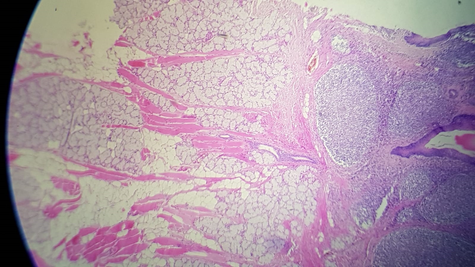 Das Präparat wurde aus dem hinteren Teil der Zunge angefertigt. An der Oberfläche findet man ein mehrschichtig unverhorntes Plattenepithel. Darunter liegt die Zungenmandel (Tonsilla Lingualis) und man erkennt zahlreiche Lymphozyten. Die Zungenmandel ist Teil des Mucosa assoziierten lymphatischen Gewebes (MALT). Unter ihr befinden sich Bindegewebe, zahlreiche muköse Drüsen mit Ausführungsgängen und quergestreifte Skelettmuskulatur.