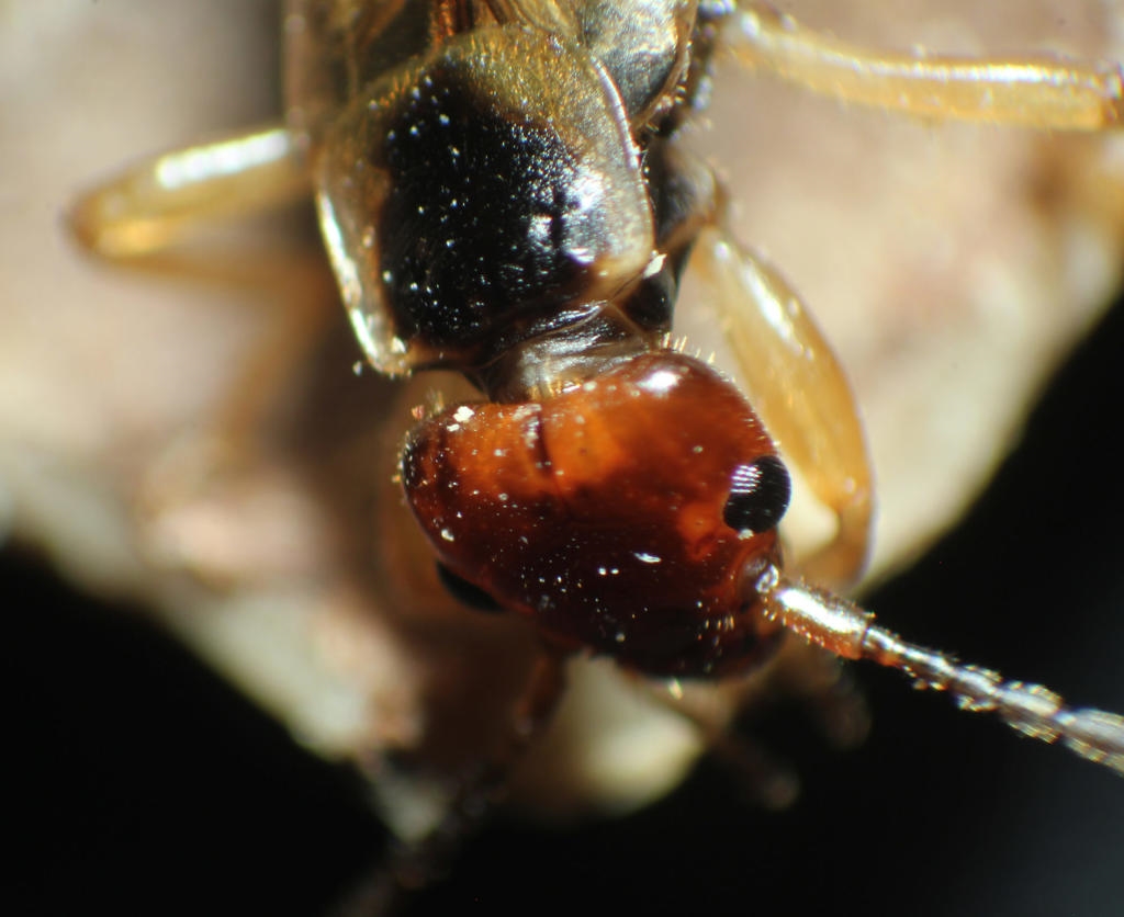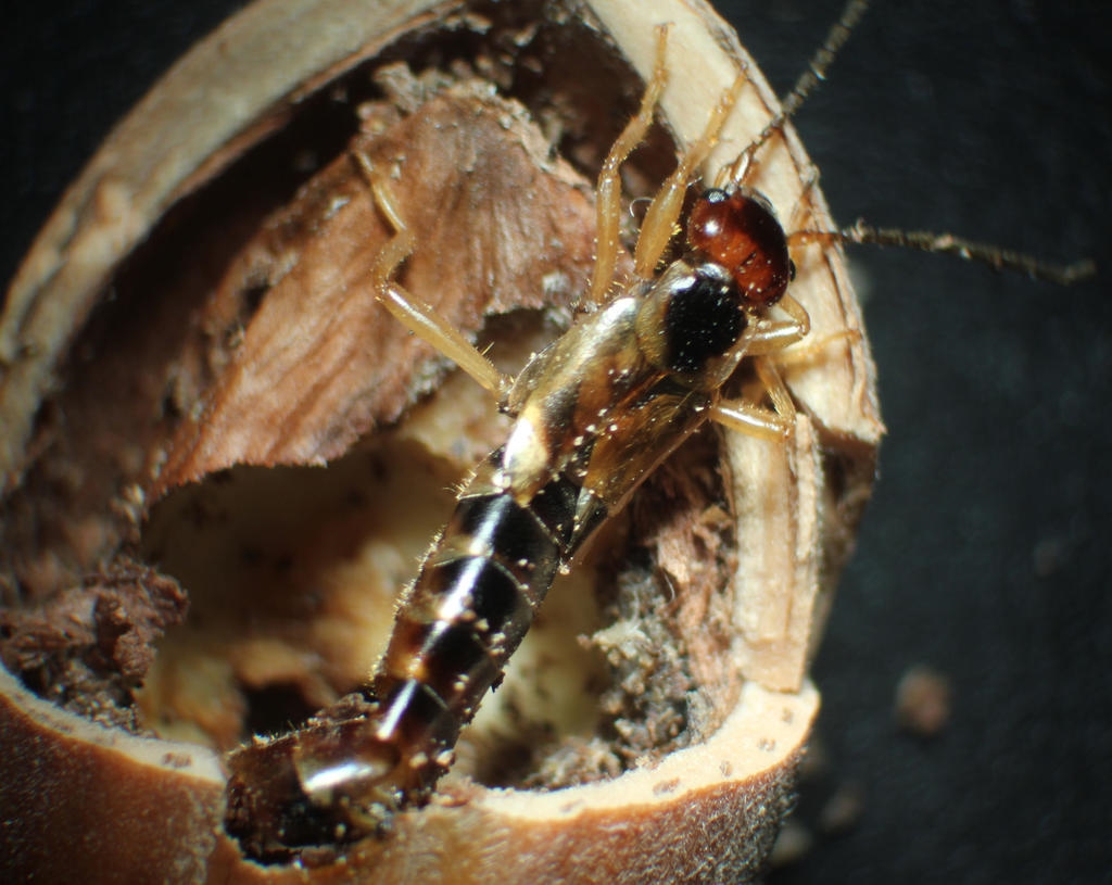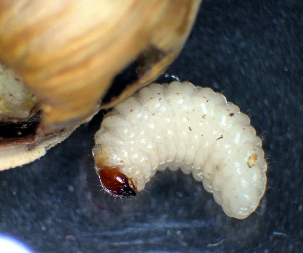 die Haselnüsse sind reif und fallen vom Baum. Leider findet man viele, die vom Haselnussbohrer (Curculio nucum) gelöchert und "taub" (ohne Kerne) sind. Seine Larven haben sich an ihnen gütlich getan. Gestern nun fand ich eine Nuss, in deren Loch ein Ohrwurm (Forficula auricularia) steckte, der wohl aufgrund seiner Gefräßigkeit weder vor noch zurück konnte  :)