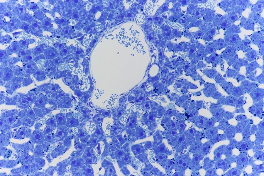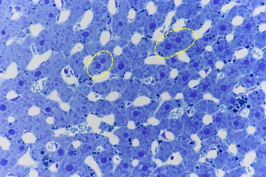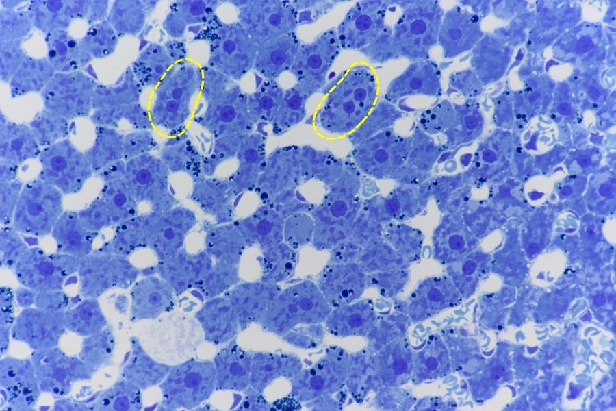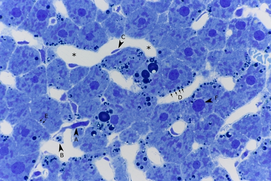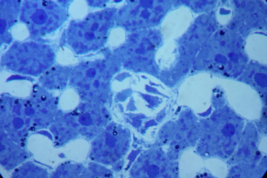 In diese Leber zeige ich einige Zellteilen die man mit Kunststoff Einbettung (hier Epon 812 Epoxid)  gut erkennen kann.