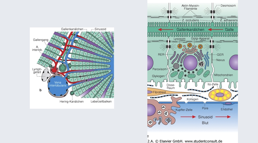 Die Wand der Sinusoide wird von dünnen Endothelzellen gebildet, deren Zytoplasma von Feldern mit unterschiedlich großen offenen Poren durchsetzt wird.