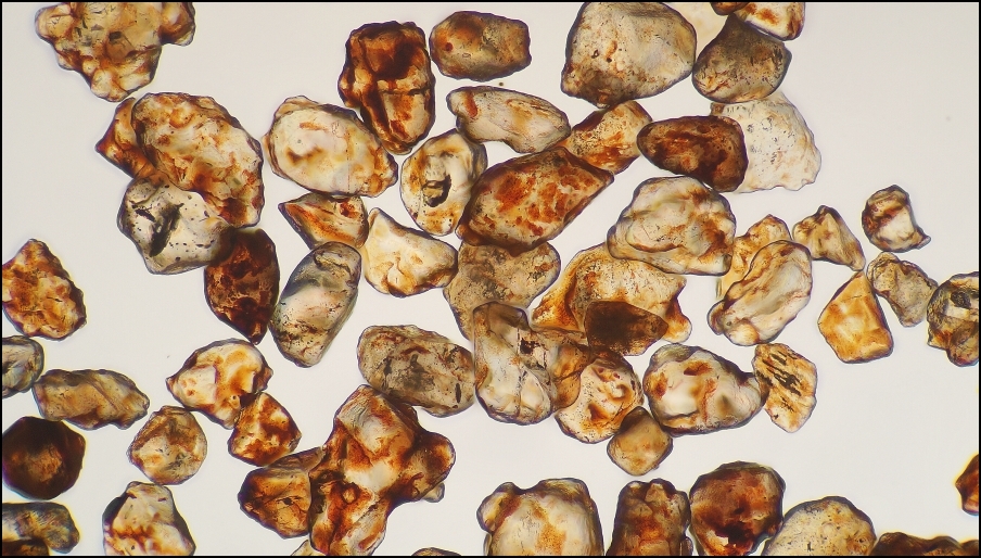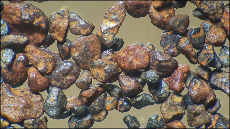 Sande, insbesondere die extrem inerten Quarz-Sande, liegen nicht selten auf zweiter, dritter oder xter Lagerstätte und haben also nach einer früheren Überkrustung (hier mit Goethit oder Hämatit) teilweise heftige Transportaktivität hinter sich. Wenn es schnell ging, in Form einer Schlammflut ('flash flood'), oder aber durch "äolisch" (durch den Wind) oder "fluviatil" (in Bächen und Flüssen) mit vielen Kontakten der einzelnen Körnchen untereinander. Je nachdem, wie Deine (sehr schön abgelichteten) Körner zueinander gefunden haben, können die ursprünglich in bodenähnlichen Strukturen gebildeten Umkrustungen nachträglich wieder abradiert worden sein.