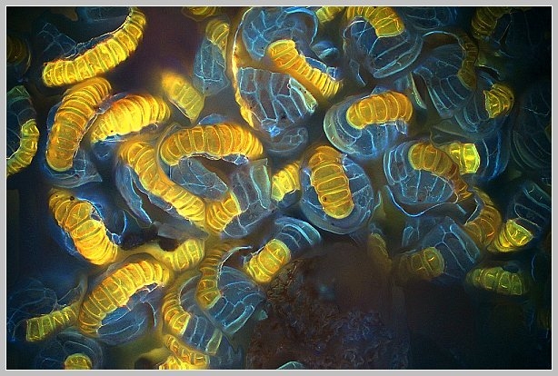 Hier noch meine Fluoreszenzversion, da sieht man auch noch das Chlorophyll rot leuchten. Violettanregung im; UV bleicht das Chlorophyll zu schnell aus.