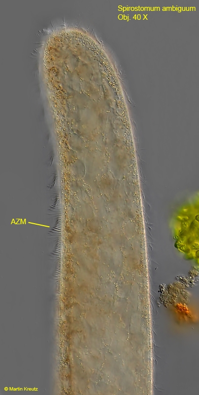 Ich hatte Spriostomum auch mehrmals unter meinem Mikroskop und habe davon Videos angefertigt. Die adorale Membranellenzone (AZM), die sich wie ein "Reißverschluss" über ca. 2/3 der Zelllänge erstreckt, ist auf meinen Aufnahmen gut zu erkennen. Vor allem dann, wenn sich Spirostomum langsam um seine Längsachse dreht. Ebenfalls war bei meinen Exemplaren die Mundöffnung (MO) sicher zu erkennen. Vom Makronukleus oder gar Mikronukleus konnte ich nichts erkennen, was auch daran lag, dass meine Exemplare extrem undurchsichtig waren. Kontraktionsvorgänge konnte ich ebenfalls beobachten und auch auf Video bannen. Wenn Interesse besteht, gebe ich den Link meines Videos mal in die Runde. Aber gebt mir noch ein wenig Zeit für die Bearbeitung. Bei mir haben sich zwischenzeitlich so viele Video-Rohdatein angesammelt, ich komme mit der Bearbeitung und dem Schnitt gar nicht mehr so schnell nach  :-\