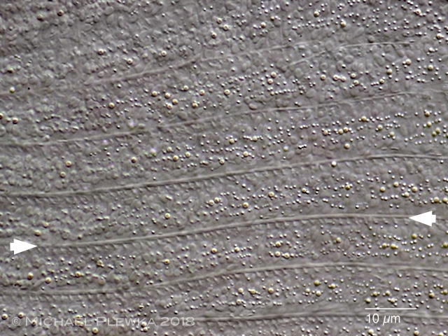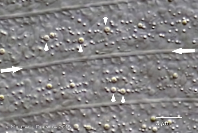 ein wesentliches Merkmal der Ciliaten ist der Kerndualismus. D.h. Makro- und Mikronukleus sind eigentlich immer vorhanden. Ich kenne bisher keine Ausnahme. Ich habe heute abend an weiteren 5 Exemplare von Spirostomum ambiguum die Kernverhältnisse genau untersucht und ich konnte wieder keine Mikronuklei eindeutig erkennen und zuordnen. Das heißt aber nichts. Sie müssen nicht dem Makronukleus angelagert sein, sondern können auch frei im Plasma liegen. Dann ist es besonders schwierig sie zu erkennen. Hat man es dann auch noch mit vollgefressenen Viechern zu tun, ist die Sache aussichtslos. Da hilft nur Färbung. Die Öltröpfchen unter der Pellikula habe ich mit dem 60 X Apo, HF, nicht abgeblendet, nochmal genau angeschaut. Sie sind bei meiner Population gelblich. Das hat aber auch nicht viel zu sagen. Wenn es wirklich Öltröpfchen sind (das ist anzunehmen), dann hängt deren Eigenfärbung evtl. von der aufgenommen Nahrung ab, wie Du vermutest.