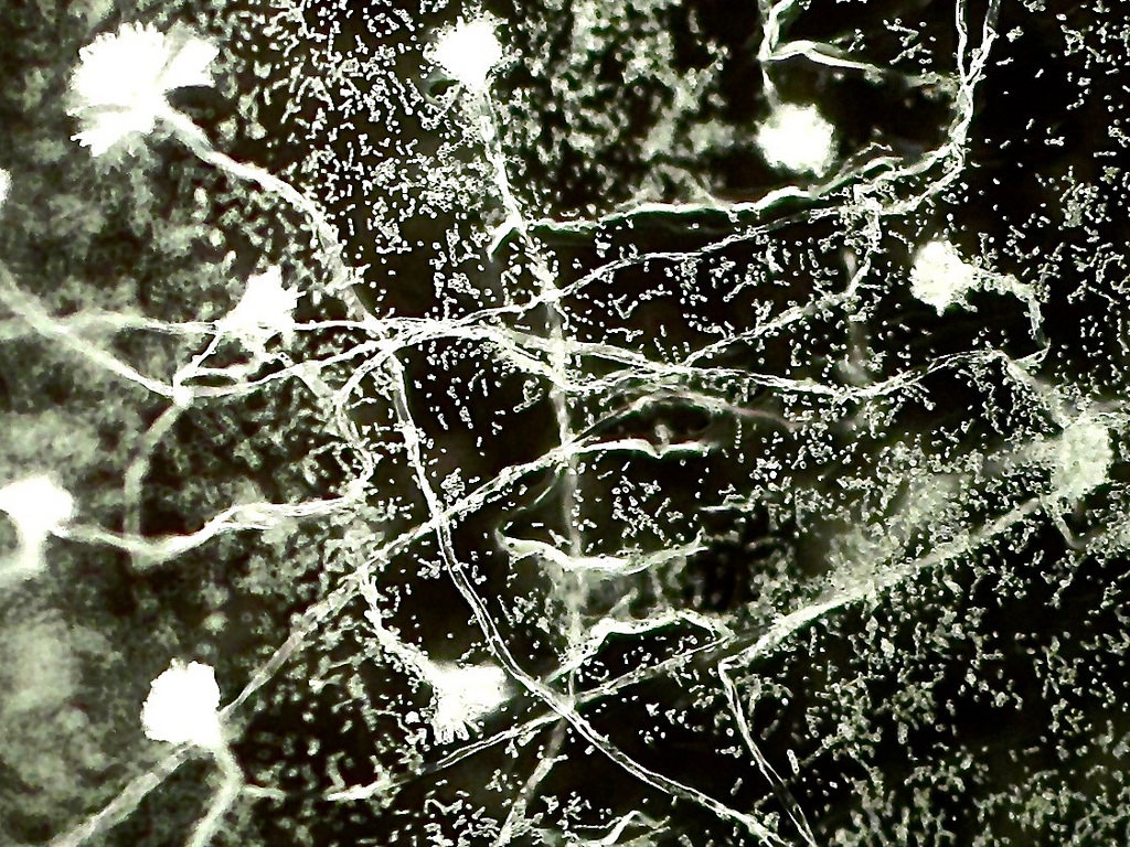 Dort war das Luftmyzel mit den Konidienträgern schon schärfer zu erkennen. Außerdem waren die zahlreichen abgeschnürten Konidien als weiße Pünktchen zu sehen.