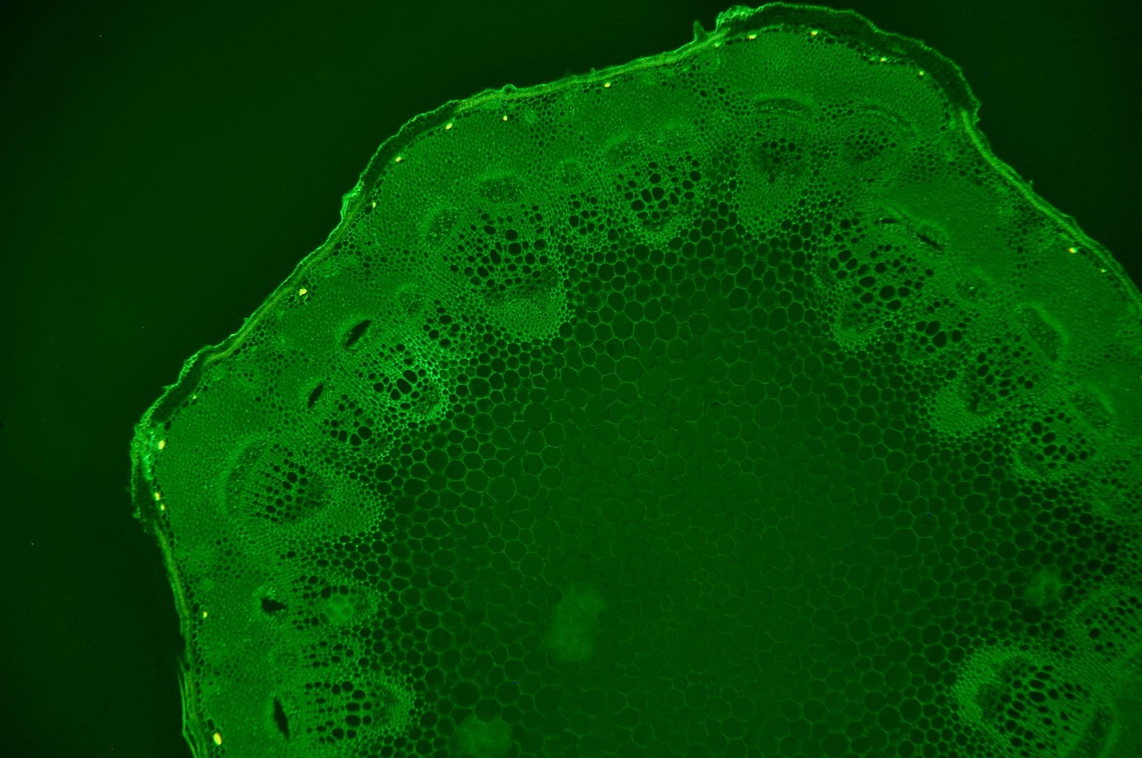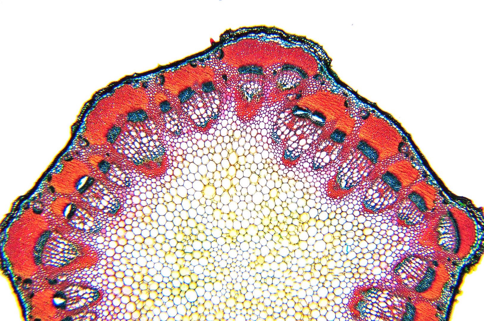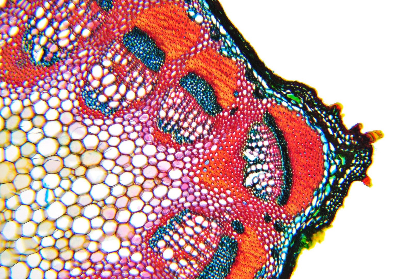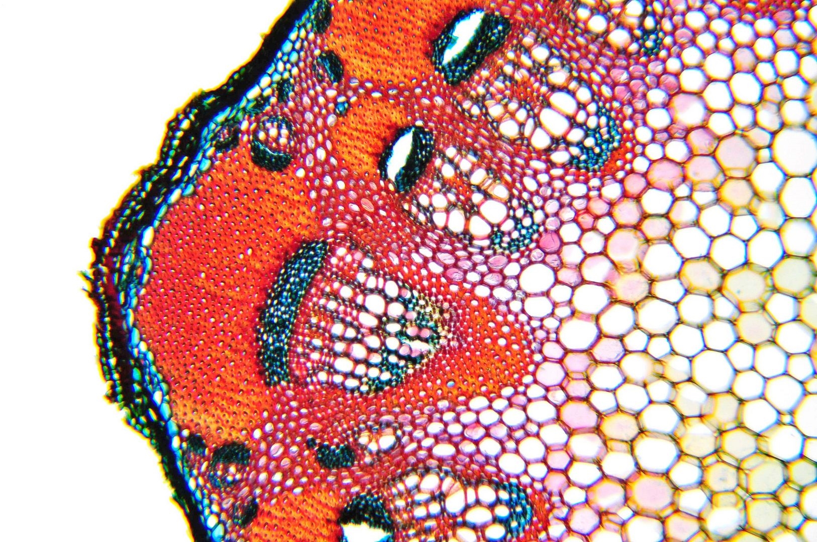Zellwände blaugrün bis grün, verholzte Zellwände leuchtend rot, Zellwände der äußeren Hypodermis orangerot, Cuticula gelb, Zellwände der innenliegenden Hypodermis tiefrot.