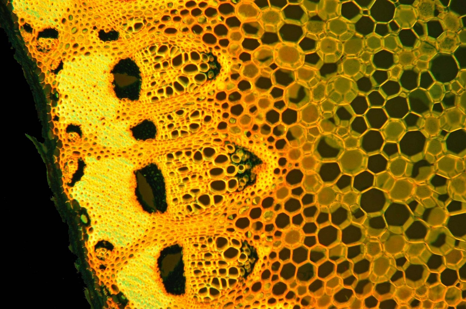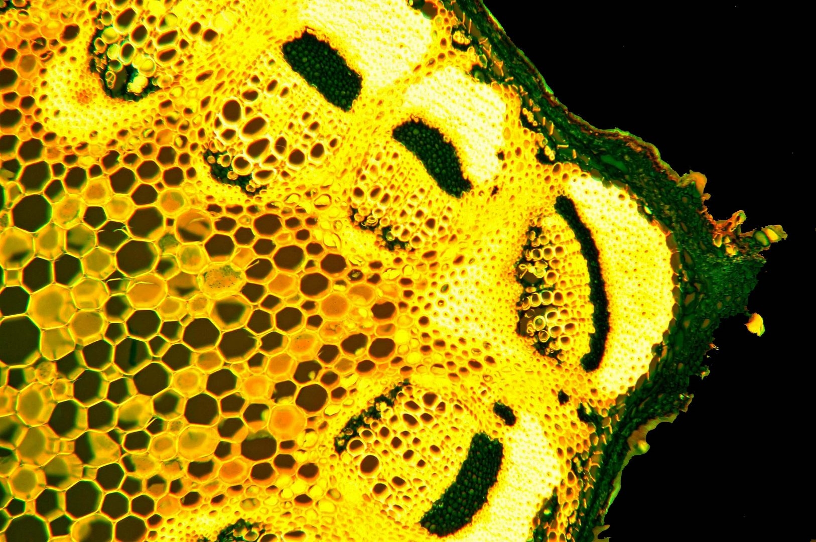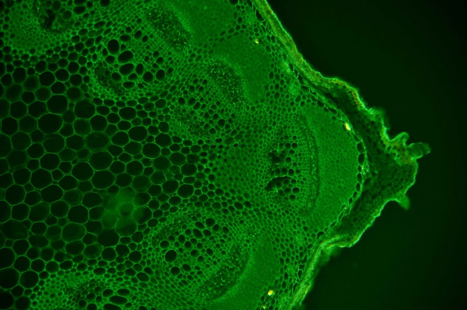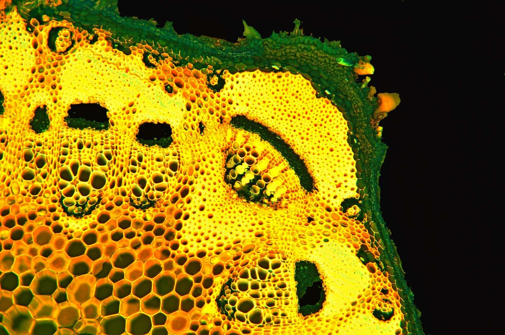 Zellwände blaugrün bis grün, verholzte Zellwände leuchtend rot, Zellwände der äußeren Hypodermis orangerot, Cuticula gelb, Zellwände der innenliegenden Hypodermis tiefrot.