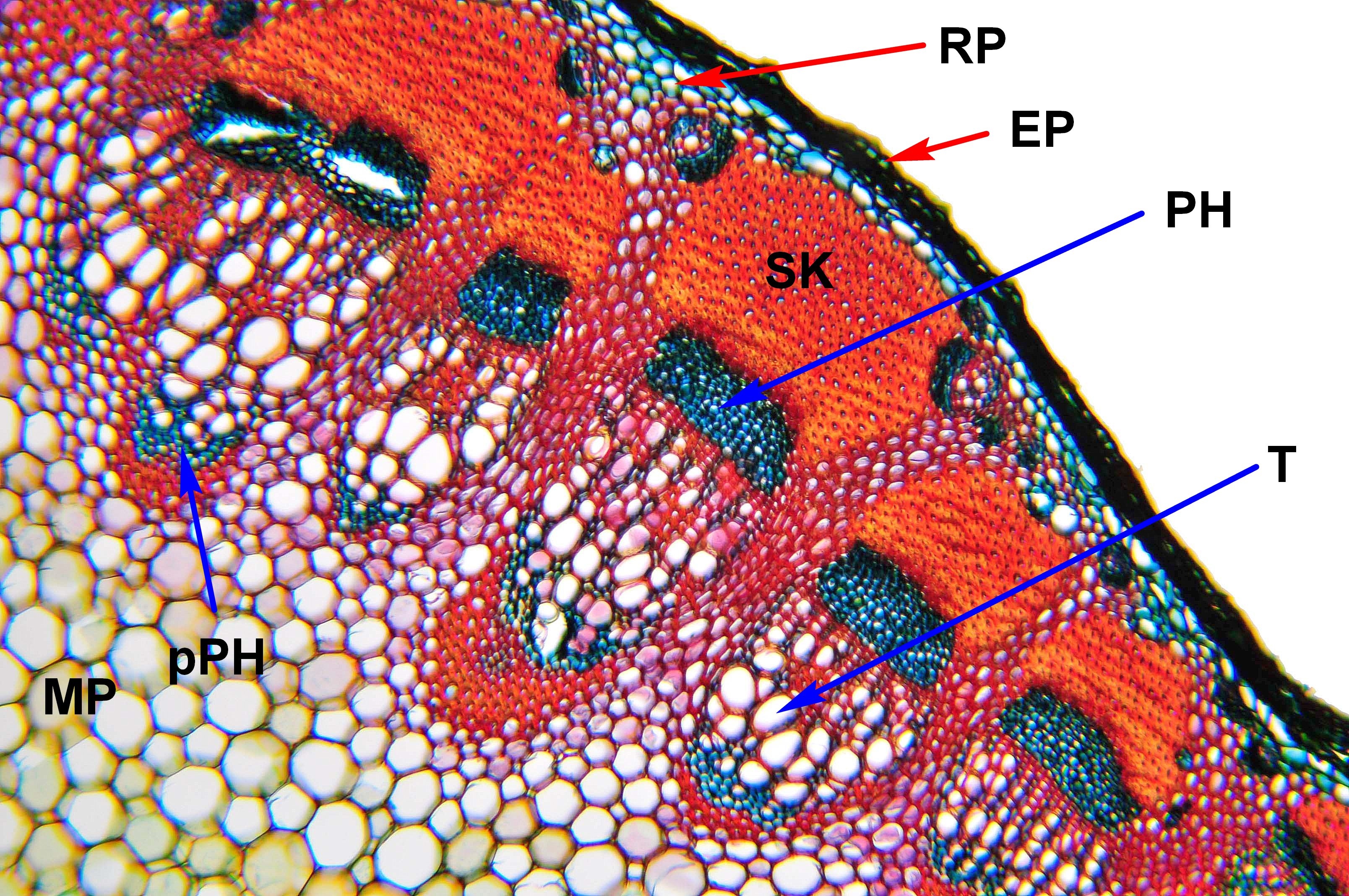 pPH = primäres Phloem, MP = Markparenchym, XY = Xylem, RP = Rindenparachym, EP = Epidermis, PH = Phloem, T = Trachee