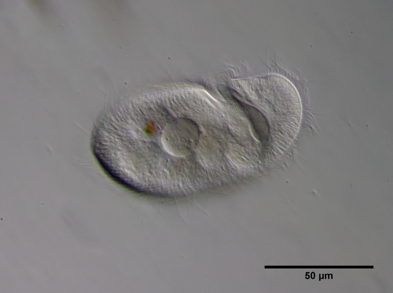 Die gefressenen Bakterien werden dann hinter der Peristomrinne in Nahrunsgvakuolen abgeschlossen und verdaut. Der Zellkern liegt knapp unter der Peristomrinne. Unter der Pellicula ist ein deutlicher Extrusomen-Saum zu erkennen.