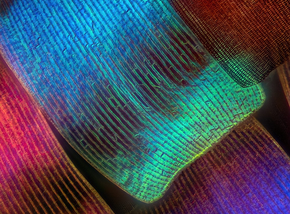 Schmetterlingsschuppen des Regenbogenfalters (Urania ripheus).
