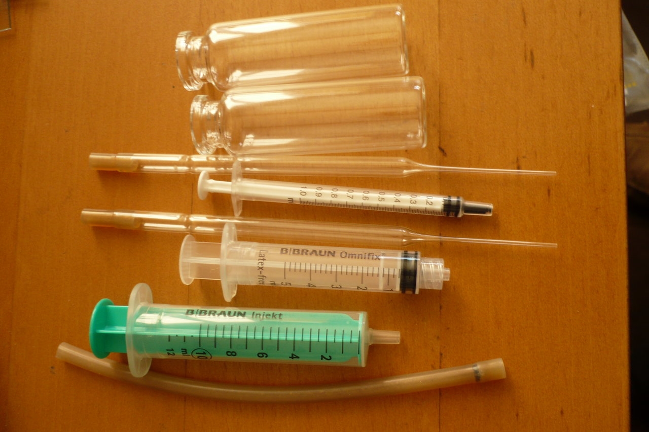 Ich habe mir jetzt mit (Einweg-)Spritzen unterschiedlicher Größe aus den Glas-Pasteur-Pipetten ,,Kolben-Pipetten" gebastelt, mit deren Hilfe das dosierte  Abziehen und Abgeben von Flüssigkeiten  wesentlich einfacher erfolgen kann. Die Verbindung der Pipetten mit den Spritzen ist sehr einfach mit einem Stück Silikonschlauch als Dicht- und Verbindungselement möglich. Dabei wird der Silikonschlauch in das obere Ende der Pipette eingeschoben und die Spritzenspitze in den Schlauch eingeführt. (Die Spritzen wie auch die Pipetten können dabei bei Bedarf gewechselt werden.)