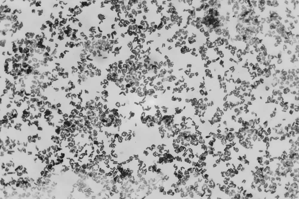Abb.4.2 Corynebacterium pseudodiphtheriae. Ein nonpathogener Erreger. Beachtenswert ist auch hier die V-förmige Lagerung der Stäbchen; im Vergleich zu Abbildung 4.1 zeigt sich die Problematik der mangelnden mikroskopischen Unterscheidbarkeit pathogener und nonpathogener Corynearten. Das Präparat stammt aus meiner Sammlung. Objektiv Leitz PL APO 100x, Okular GW 10x.