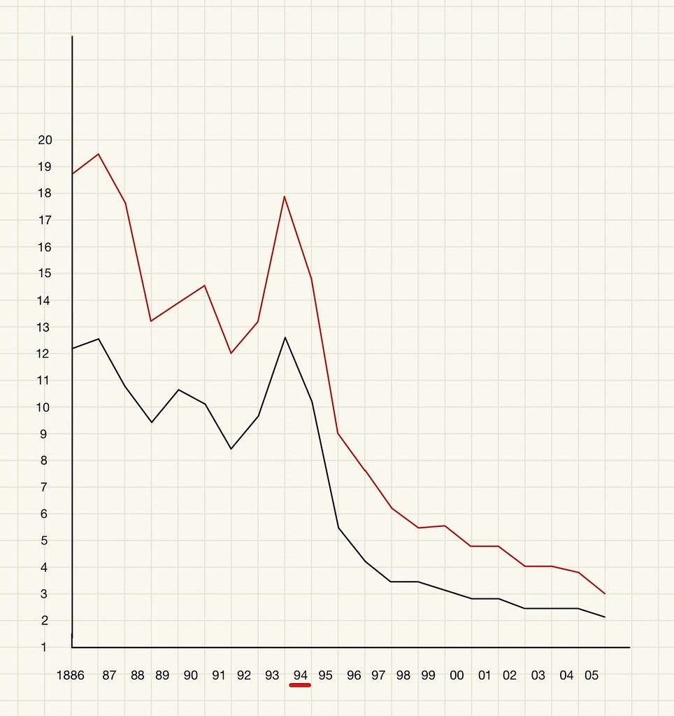 Abb.3  Auswirkung der Einführung der Serumtherapie im Jahre 1894 auf die Diphtherie-Sterblichkeit. Angegeben ist die Sterblichkeit auf je 10.000 Einwohner. Die schwarze Linie bezieht sich auf deutsche Orte mit 15.000 und mehr Einwohnern. Die rote Linie zeigt die Sterblichkeit in Preussen. Grafik vergleiche [11].