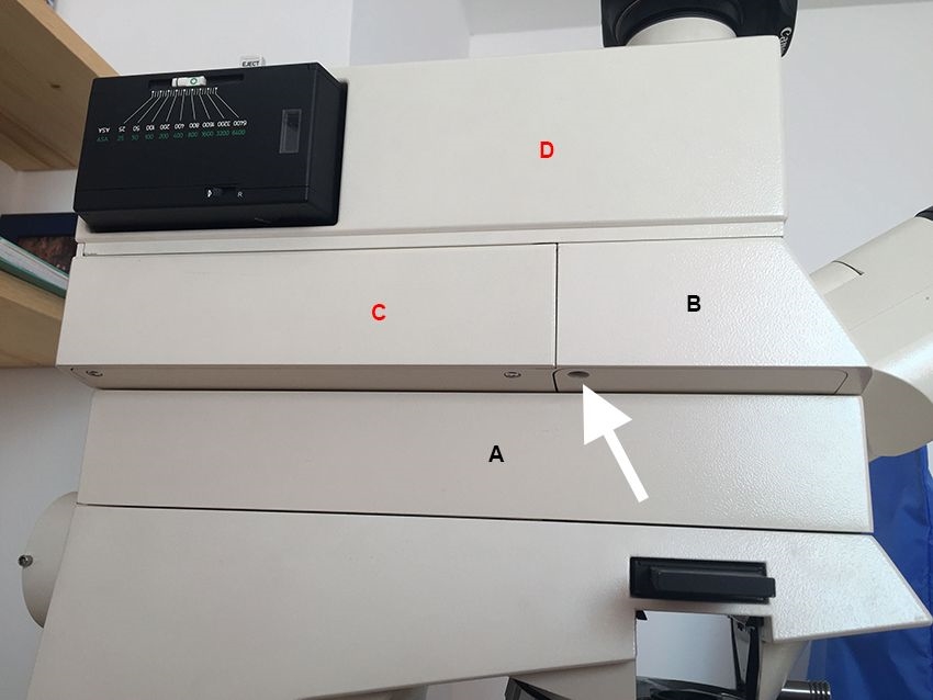 Der Idealfall wäre, dass man die Komponenten C und D entfernen kann, nur A (Optovar 1x, 1,25x, 1,6x und 2x) und B (Beobachtungstubus) erhalten bleiben und trotzdem die Möglichkeit besteht, die Kamera an B anzusetzen.