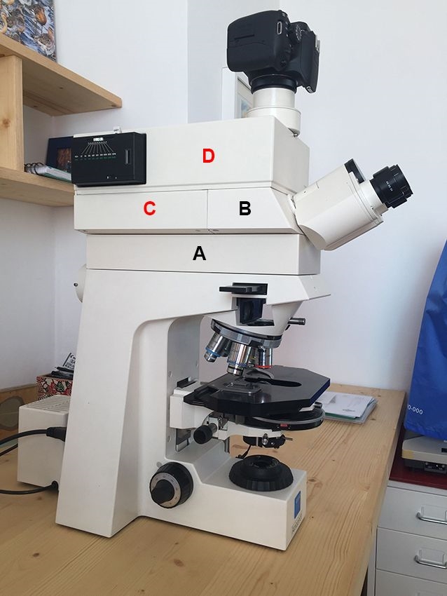 Schon jetzt lässt sich mit dem Gerät gut arbeiten, ich würde aber gerne den gewaltigen Aufbau oberhalb der Objektive noch verschlanken. In der jetzigen Konfiguration stellt das Mikroskop wohl so etwas wie das Phomi der Unendlich-Ära dar, mit 4 Kameraanschlüssen bzw. -kameras. In der folgenden Abbildung habe ich die vier unterscheidbaren Komponenten des Beobachtungs- bzw. Dokumentationsaufbaus mit A-D bezeichnet.