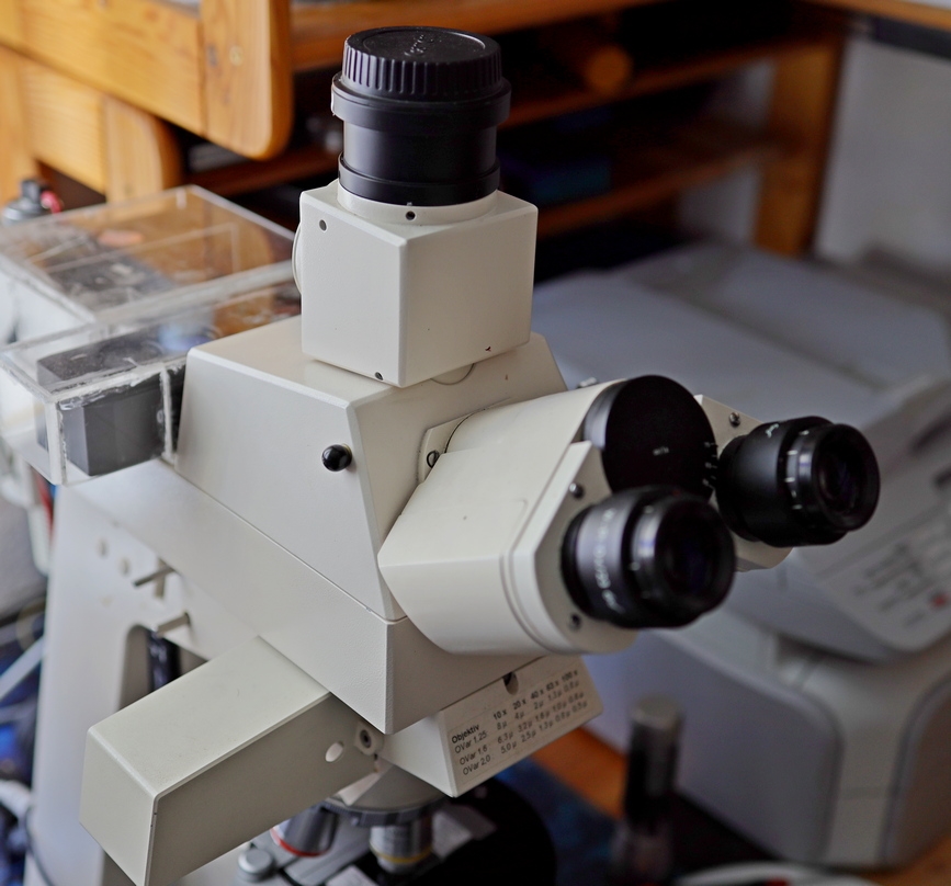 Verworrene Umstände haben dazu geführt, dass ich seit einigen Tagen ein Zeiss Axiophot bei mir auf dem Mikroskopie-Tisch stehen habe (vor dem achtlosen Entsorgen gerettet; trotz eigentlich festem Vorsatz, für die nächsten Dekaden keine neuen Stative mehr zu übernehmen, war hier rasche, unbürokratische Hilfe das Gebot der Stunde, jetzt ist das Kind in den Brunnen gefallen und eines der Zeiss Flaggschiffe der 80/90er steht da).