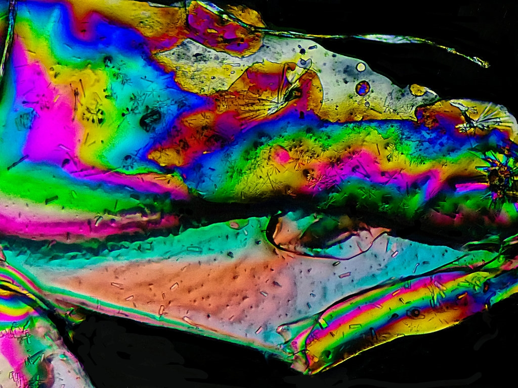 Anisotrope Kristalle gestackt mit Okularkamera und Lomo Uhrwerks-Biolam