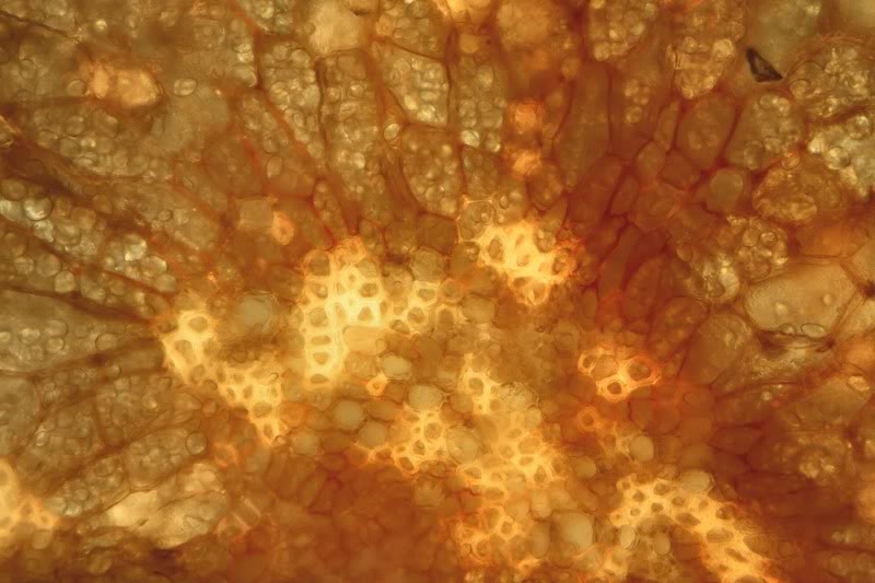 richtig! das verdächtige Glitzern der Stärkekörner spricht für sich. Hat aber nix mit der schönen rotbraunen Zellwandfärbung zu tun und ich benutze den Polfilter eher zur Lichtreduzierung bis ich eine bessere Beleuchtung habe. Wenn man die Stärke in diesem Rhizom mit JJK färbt wird es Nacht!