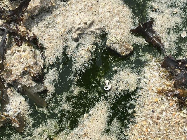 Bei Ebbe am Sandstrand der Bretagne befanden sich in kleinen Abflusskanälen  diese dunklegrünen Flecken, die ich vorher noch nie wahrgenommen hatte  und zunächst für (Blau-) Algen hielt: