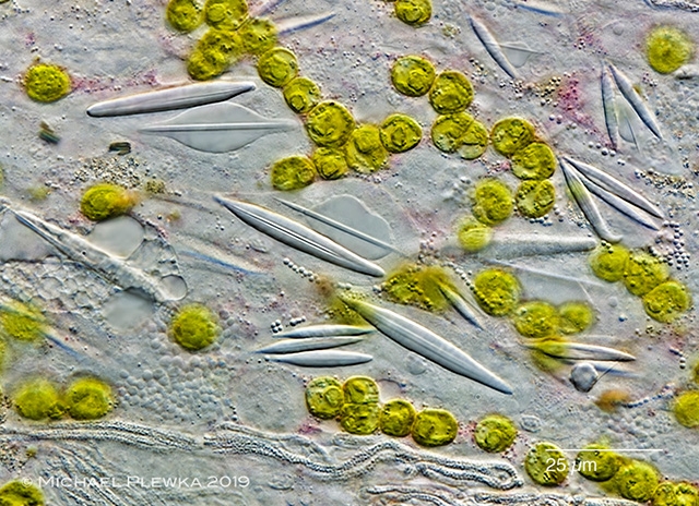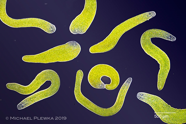 Betrachtet man einen kompletten plattgedrückten Wurm, so fallen  bei stärkerer Vergrößerung natürlich die grünlichen Gebilde auf, die quasi in 5 Längsreihen im Körper angeordnet sind. In den 4 helleren Streifen dazwischen befinden sich Nerven und Spermienkanäle. Bei den grünlichen Körperchen handelt es sich um "abgespeckte" Algen (Protoplasten)  der Art Tetraselmis convolutae, d.h. solche, denen die  Zellwand, die 4 Flagellen sowie der Augenfleck fehlen: