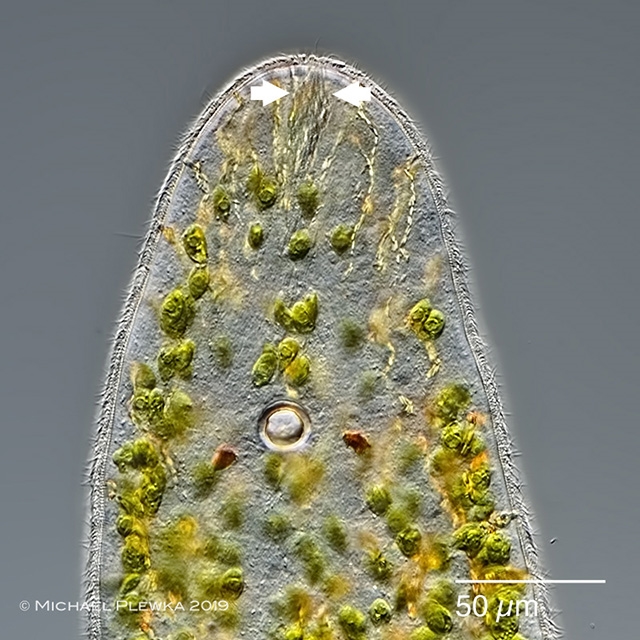 Bei näherer Betrachtung zeigen sich einige Merkmale am Vorderkörper wie z.B. dieses stark lichtbrechende Gebilde (im Zentrum des Bildes) , das als Statolith bezeichnet  und als Lagesinnesorgan interpretiert wird. Links und rechts davon zwei Augenflecken. Die Pfeilspitzen weisen auf das Frontalorgan (?? Funktion ??):