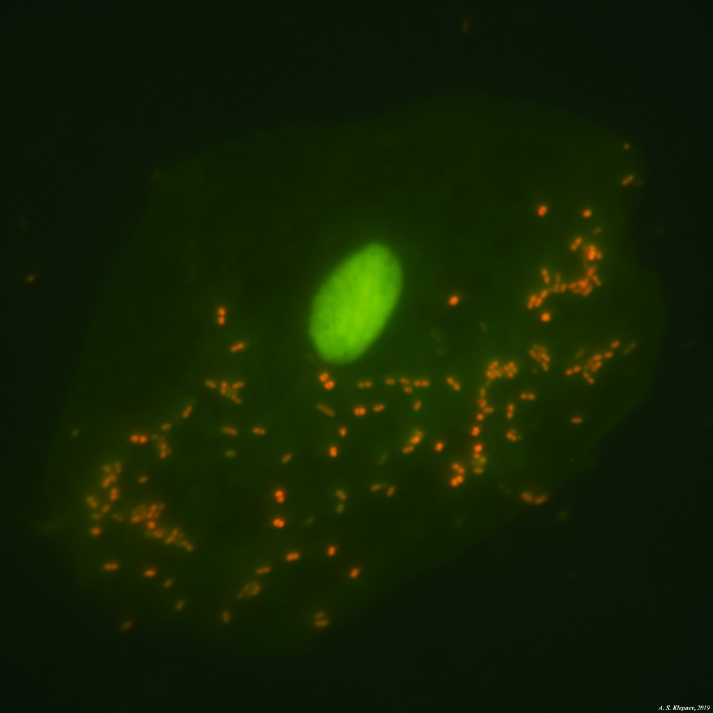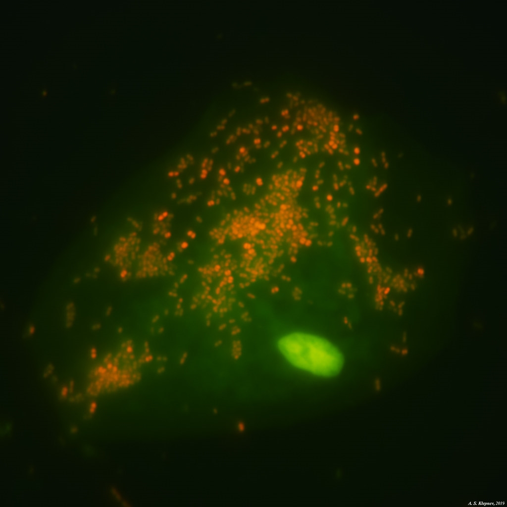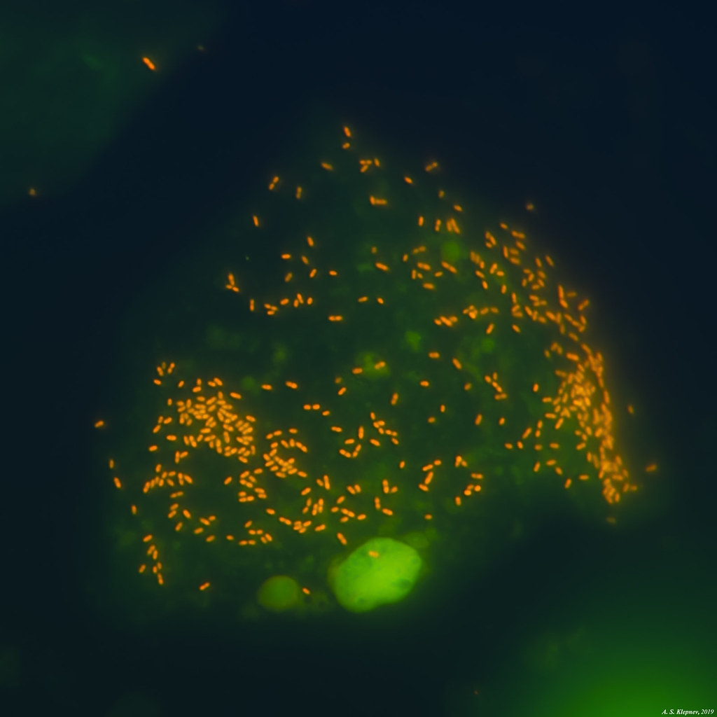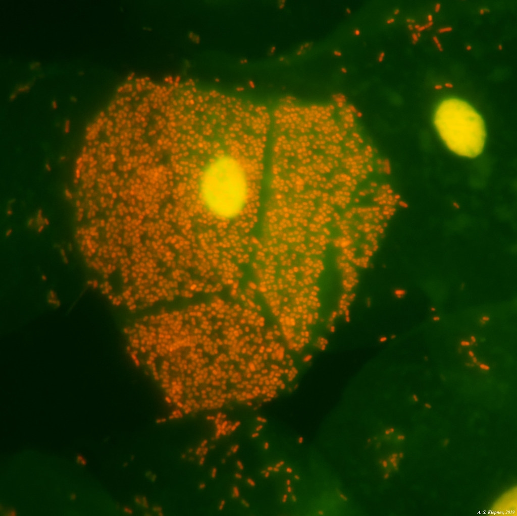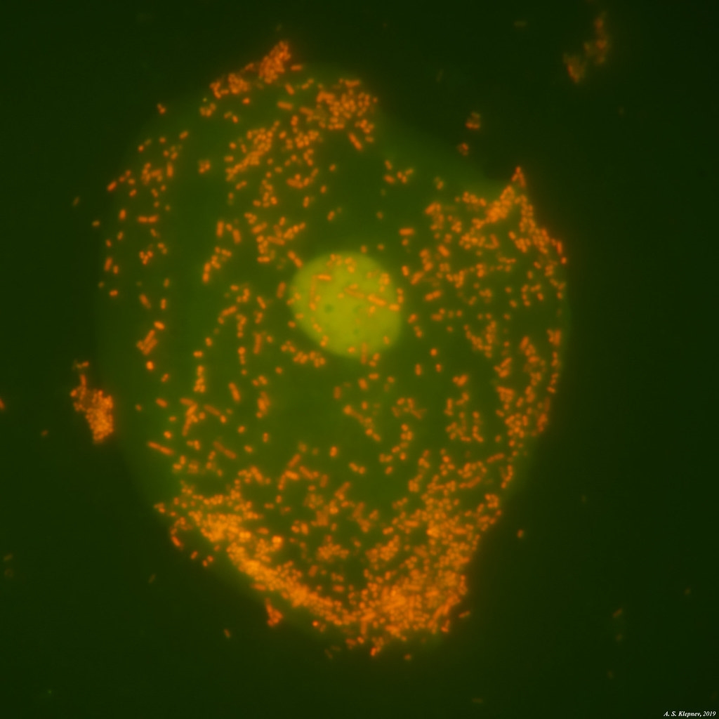 Bukkale Epithelzellen und Bakterien auf ihnen. Acridinorange färben. LOMO Lumam R-8 Mikroskop, 100x Objektiv