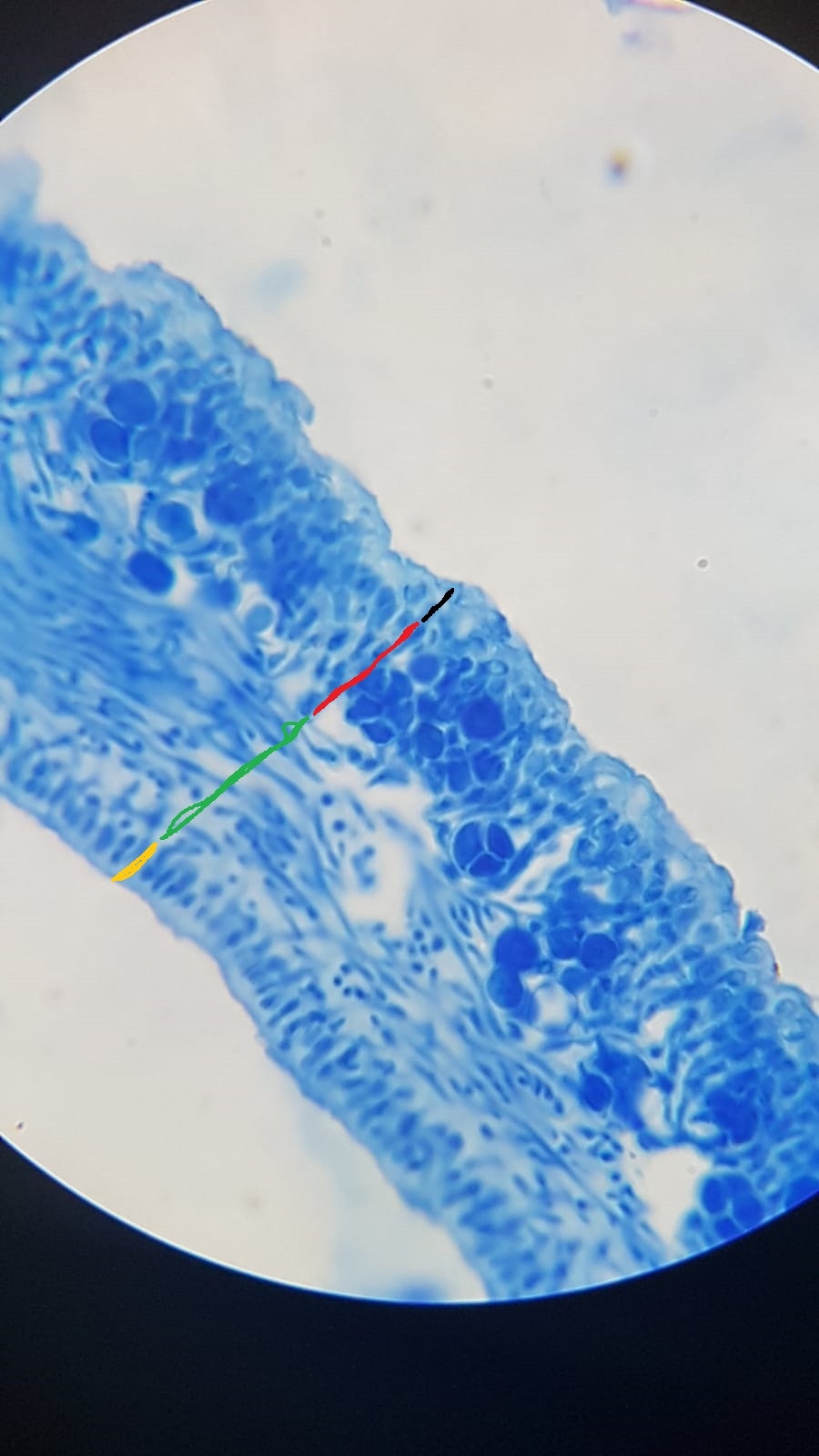 Abb. 3: schön erkennt man den Schichtenaufbau einer Flechte; schwarz = obere Rinde; rot = Algenschicht; grün = Mark aus lockeren Hyphen; gelb = Unterrinde