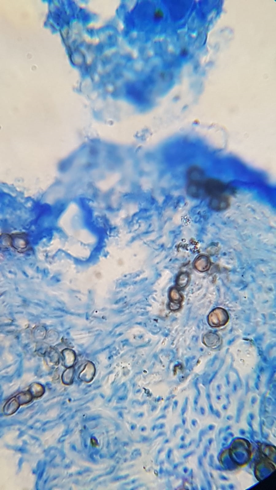 in vivo bzw. gleich nach der Färbung mit Baumwollblau sehen die Sporen so aus, hier eine ältere Aufnahme: