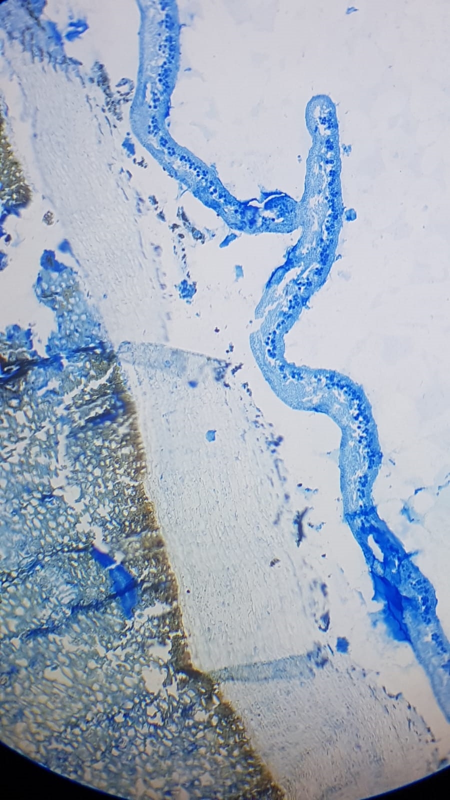 Ich präsentiere den Querschnitt (ca 4 um) der Rinde einer Kiefer, die mit Gelbflechte (Xanthoria parietina) überwachsen war. Leider ist das Anfertigen von Paraffinschnitten durch so verholztes Material schwierig, weshalb der Schnitt ein paar Falten aufweist. Gefärbt wurde mit Lactophenol-Anilinblau (leider gab es ein paar Farbstoffniederschläge).