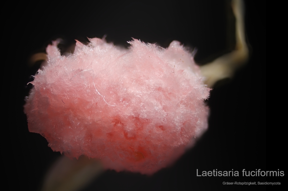vergleiche doch mal mit Laetisaria fuciformis. Hier https://www.pilzforum.eu/board/thread/45714-rosa-wuschel-dingens-auf-dem-trockenrasen-was-ist-dies-ein-pilz/ war kürzlich eine Anfrage zu einem vergleichbaren Objekt, und hier  https://www.123pilzsuche.de/daten/details/Rotspitzigkeit.htm  ist eine Beschreibung.
