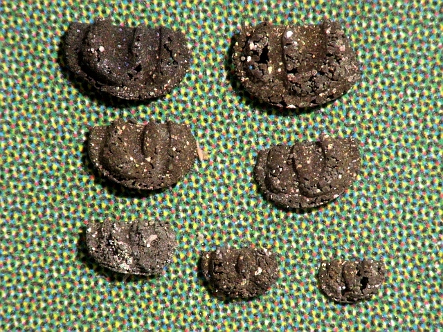 Ostracoden sind sicherlich ein schönes Objekt für das REM. Dafür müssen sie mit Gold bedampft werden. Geologen und Paläontologen sind aber die Kirchenmäuse unter den Naturwissenschaftlern. Die haben oft nur ein Stemi zur Verfügung, und weder Geld noch Gold. Daher muss dann eben auch mal Katzengold ausreichen, um die Schalen zu bedampfen. Hier mal ein Beispiel - Beyrichien aus einem silurischen Geschiebe - wie das dann aussieht.