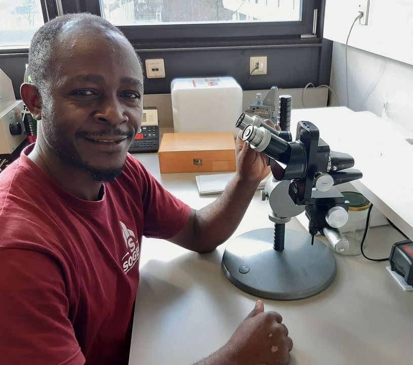Pierre braucht sich nun nicht mehr auf den Boden zu legen, um die Kriebelmückenlarven im Becherglas zu beobachten!