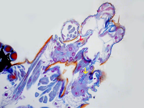 In der unteren Mitte ist wohl ein Stück des Pharynx oder des Cibariums zu sehen. Die Drüsen wandern beidseitig  des schräg getroffenen Nahrungskanals offenbar unter dem Clypeus in Richtung Mundwerkzeuge. Der gelbe Pfeil zeigt einen Ausführungsgang, der bereits in Richtung der Mundwerkzeuge verläuft und teils längs geschnitten ist. Bei der linken Drüse ist der Ausführungsgang hingegen noch quer getroffen. Da meine Schnittführung aber ziemlich schräg verläuft ist, ist, so glaube ich, beim roten Pfeil bereits wieder ein Stück Ausführungsgang zu sehen.